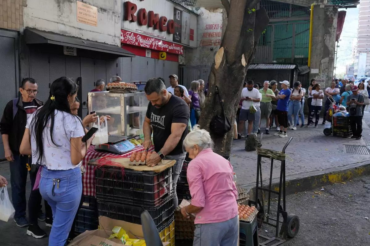Shoppers line up to buy eggs in Caracas, Venezuela, Sunday, Jan. 4, 2026. (AP Photo/Ariana Cubillos)