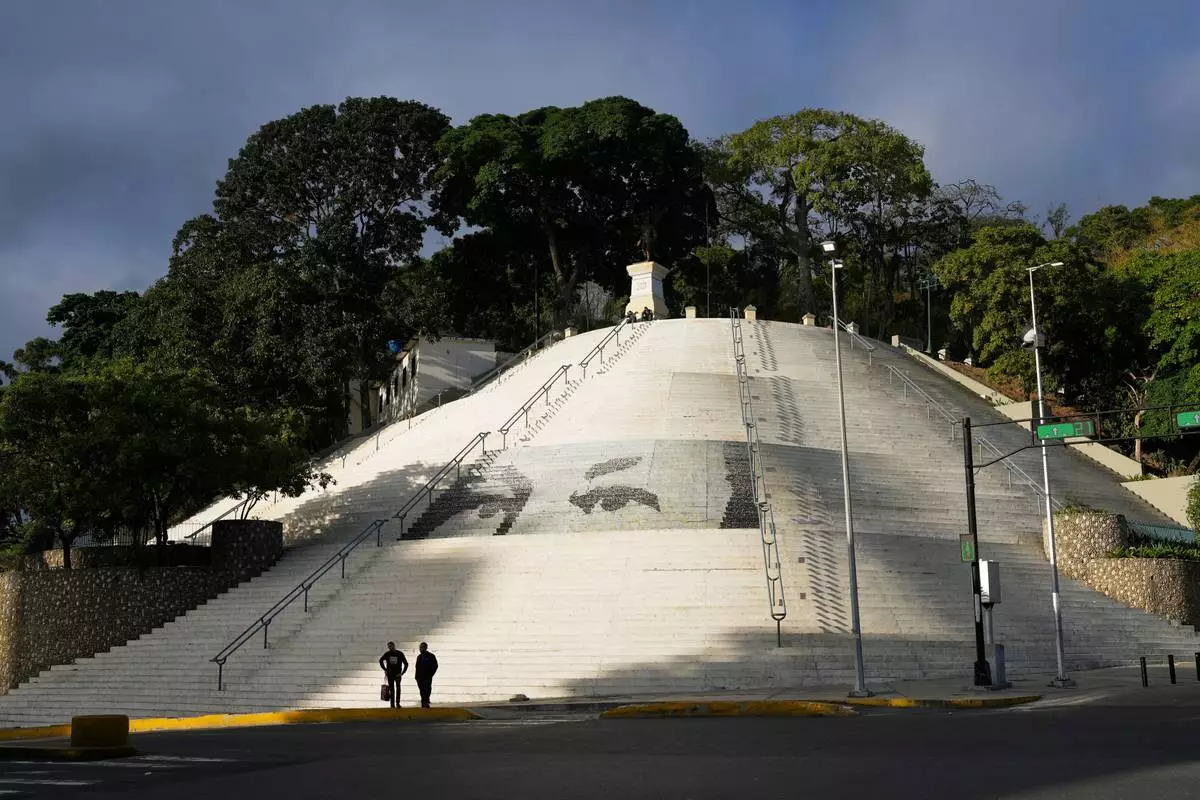 Pedestrians stand in a square decorated with images of the eyes of former President Hugo Chavez in Caracas, Venezuela, Sunday, Jan. 4, 2026. (AP Photo/Ariana Cubillos)