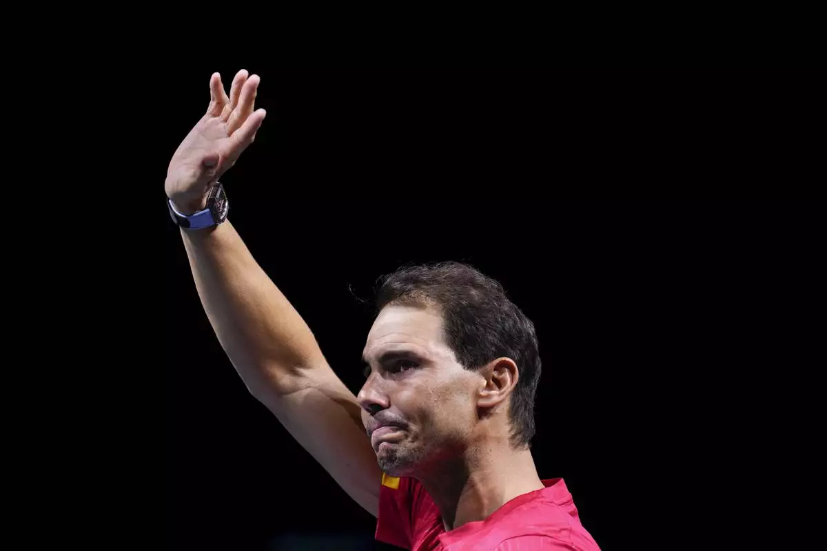 Spain's tennis player Rafael Nadal waves to the crowd after losing against Netherlands' Botic Van De Zandschulp during a Davis Cup quarterfinal match at Martin Carpena Sports Hall in Malaga, southern Spain, on Tuesday, Nov. 19, 2024. (AP Photo/Manu Fernandez)