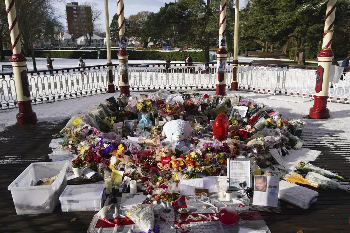 Floral tributes to singer Liam Payne at a memorial in West Park in his hometown of Wolverhampton, England, Wednesday, Nov. 20, 2024. (Jacob King/PA via AP)