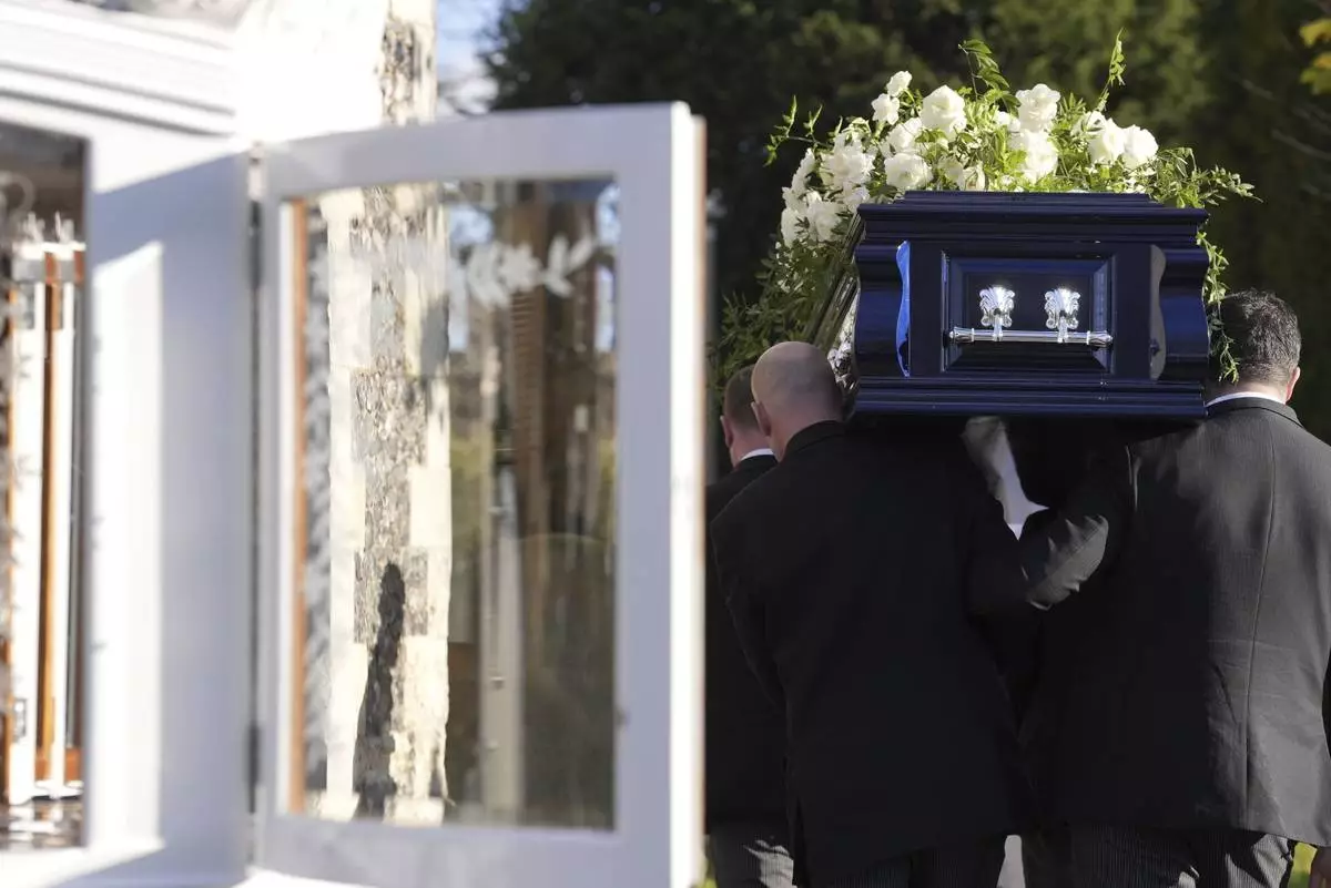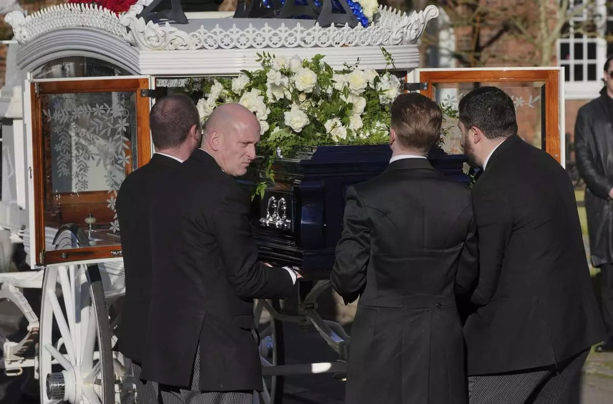 Liam Payne's coffin is carried into the funeral service for the One Direction singer at St Mary's Church in Amersham, Buckinghamshire, England, Wednesday Nov. 20, 2024. (Andrew Matthews/PA via AP)