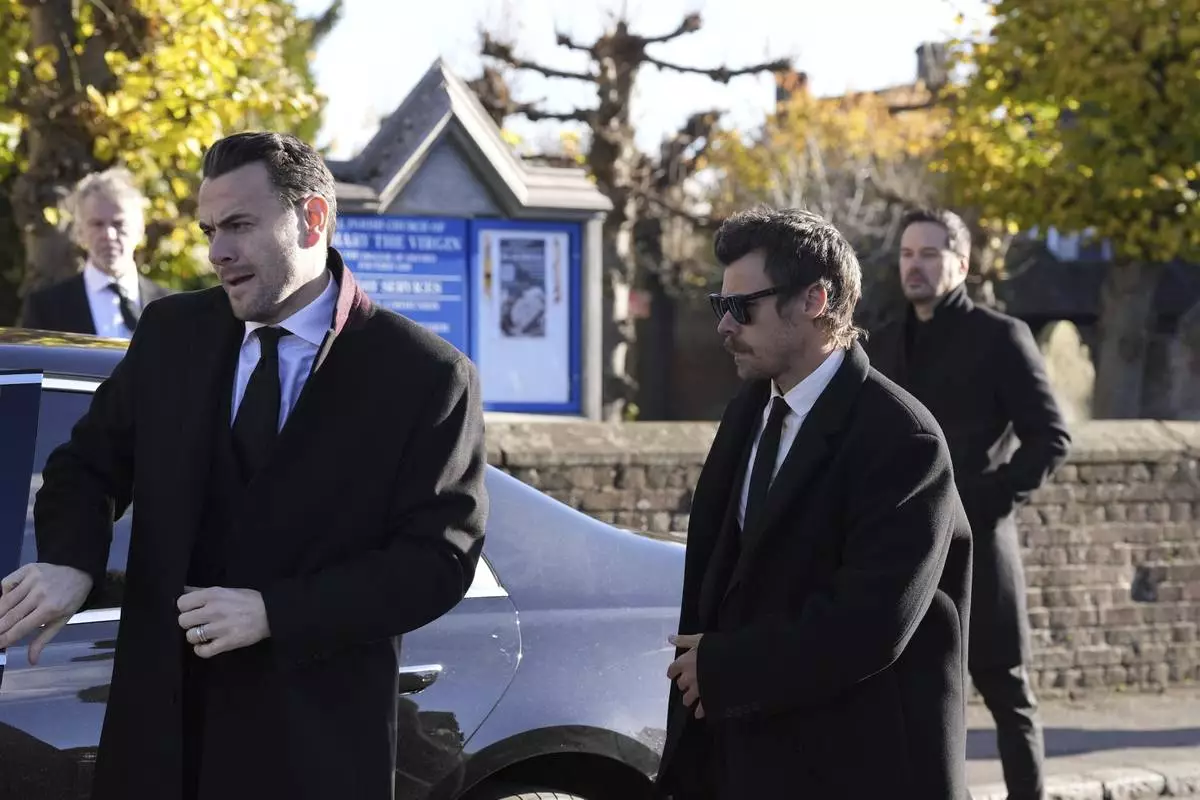 Harry Styles arrives for the funeral service of One Direction singer Liam Payne at St Mary's Church in Amersham, Buckinghamshire, England, Wednesday Nov. 20, 2024. (Andrew Matthews/PA via AP)