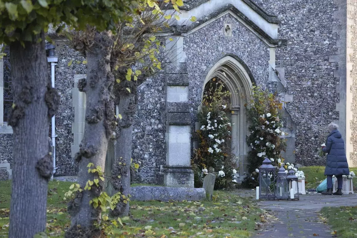 A horse-drawn carriage carried the coffin to St. Mary’s Church in Amersham, 25 miles (40 kilometers) northwest of London. Undertakers carried the dark blue casket with silver handles, topped with white roses, into the 800-year-old church for the private service.