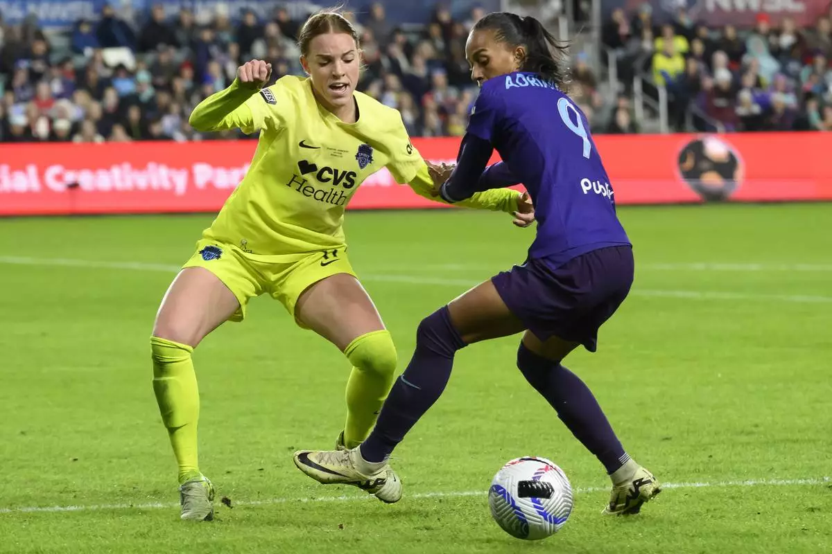 Washington Spirit midfielder Hal Hershfelt, left, and Orlando Pride forward Adriana (9) battle for control of the ball during the second half of the NWSL championship soccer game at CPKC Stadium, Saturday, Nov. 23, 2024, in Kansas City, Mo. (AP Photo/Reed Hoffmann)