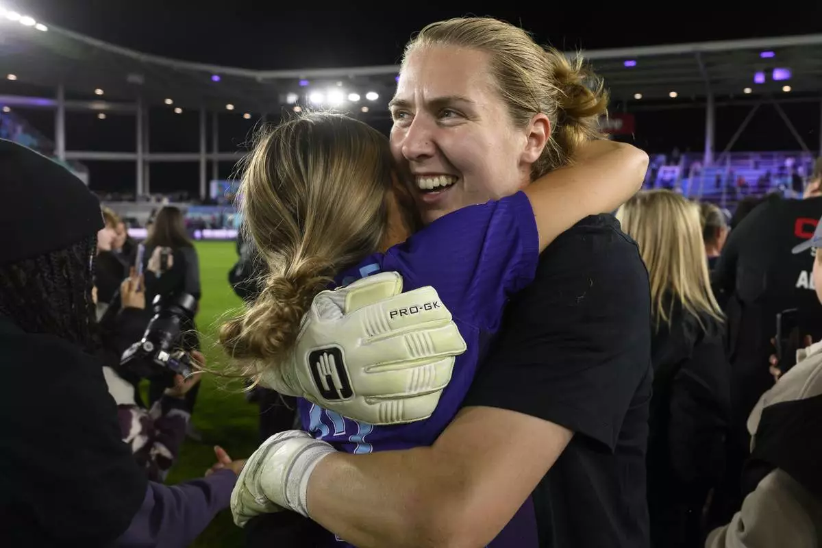 Orlando Pride goalkeeper Anna Moorhouse, right, hugs Pride defender Carrie Lawrence after they defeated the Washington Spirit in the NWSL championship soccer game at CPKC Stadium, Saturday, Nov. 23, 2024, in Kansas City, Mo. (AP Photo/Reed Hoffmann)
