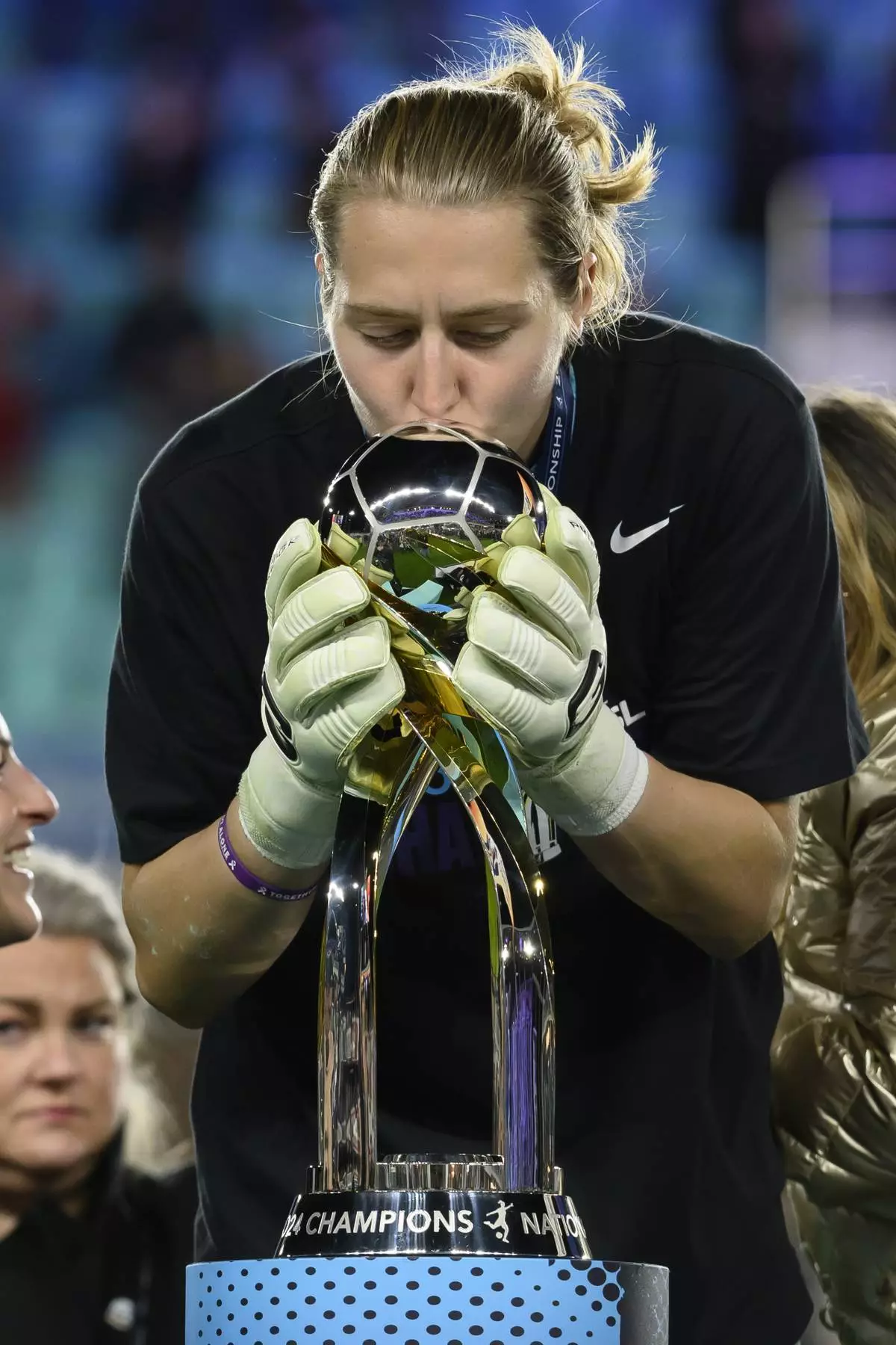 Orlando Pride goalkeeper Anna Moorhouse kisses the trophy after the team defeated the Washington Spirit in the NWSL championship soccer game at CPKC Stadium, Saturday, Nov. 23, 2024, in Kansas City, Mo. (AP Photo/Reed Hoffmann)