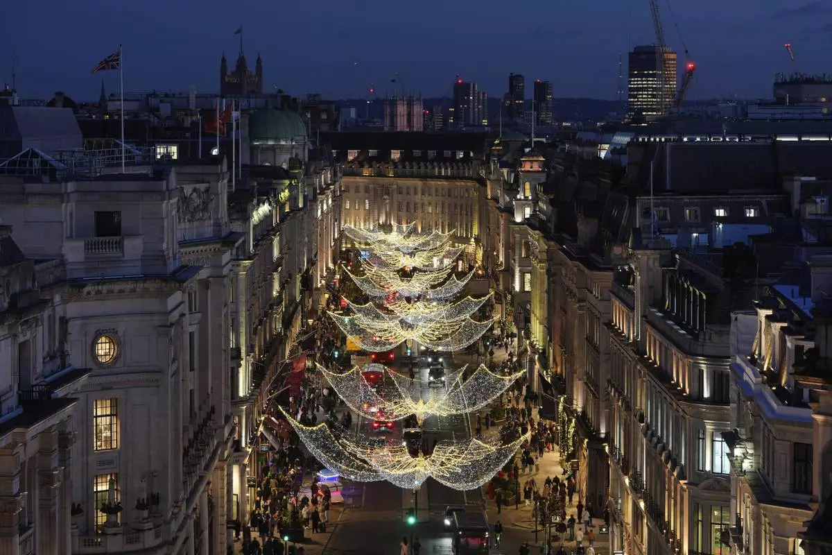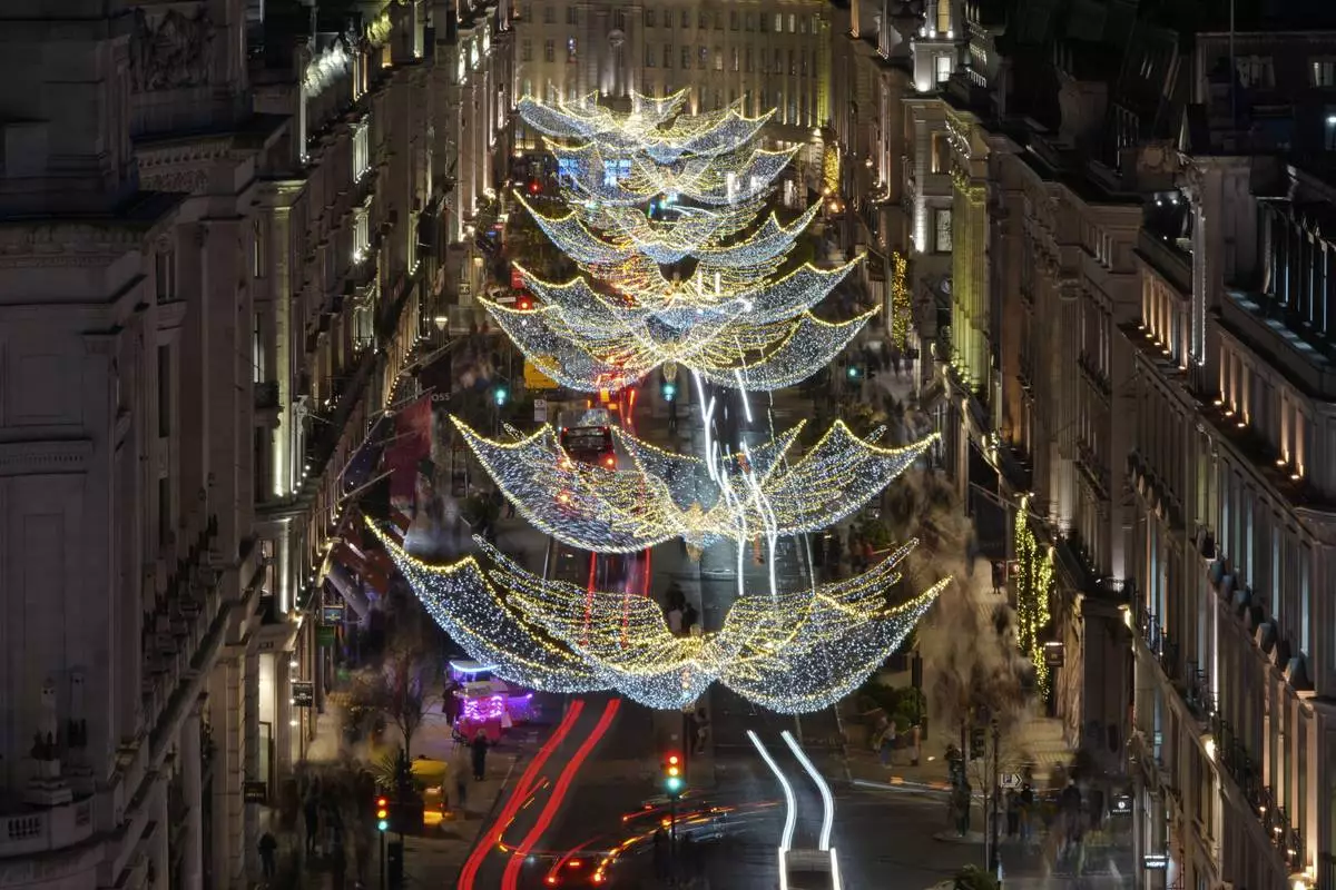 Christmas lights are displayed on Regent Street, in London, Wednesday, Nov. 20, 2024. (AP Photo/Kin Cheung)