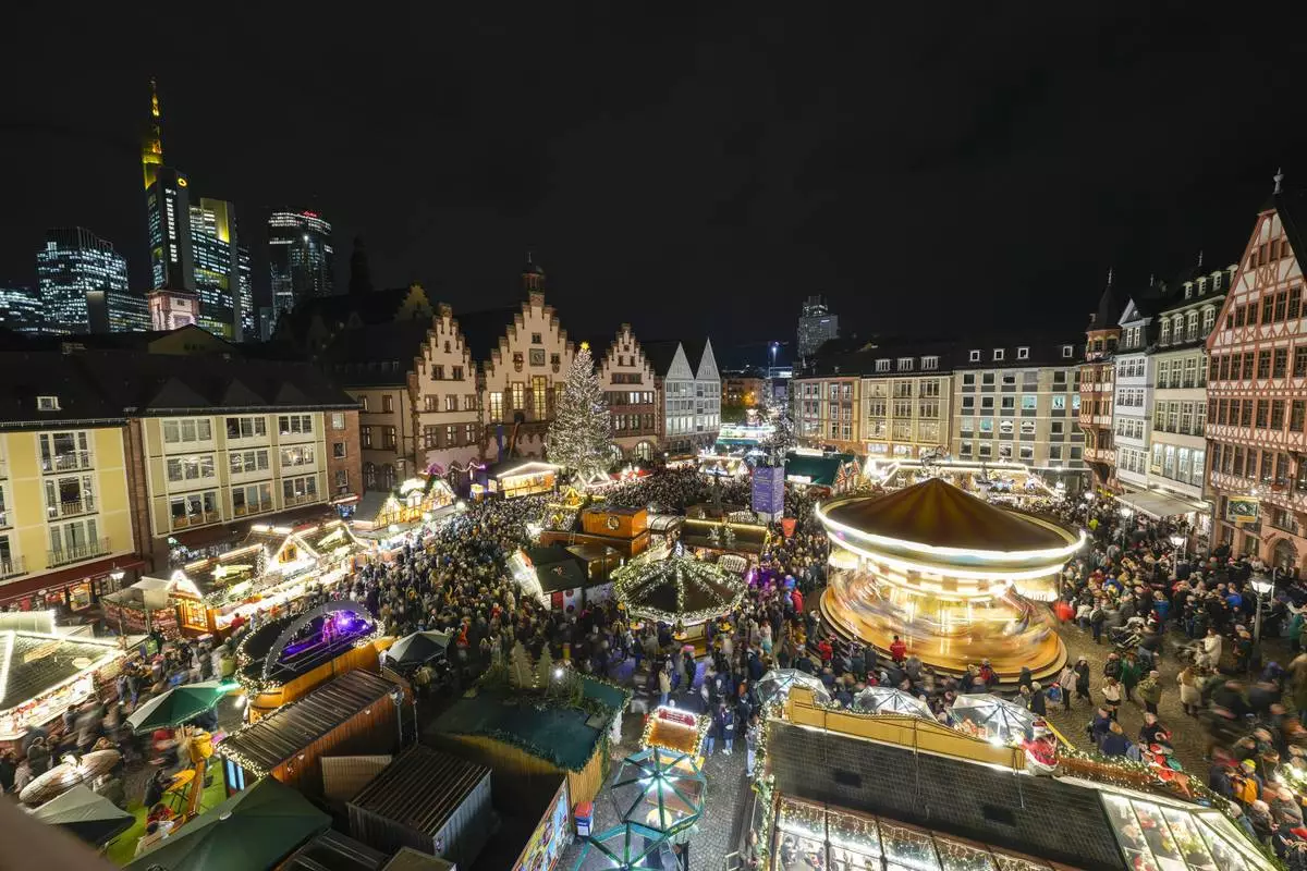 Lights illuminate the traditional Christmas Market that was opened in Frankfurt, Germany, Monday, Nov. 25, 2024. (AP Photo/Michael Probst)