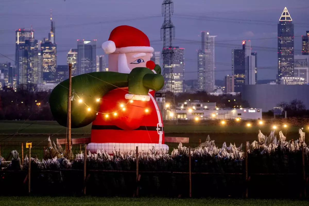 A large inflatable Santa Claus decorates the stall of a Christmas tree dealer in the outskirts of Frankfurt, Germany, Tuesday, Dec. 3, 2024. (AP Photo/Michael Probst)