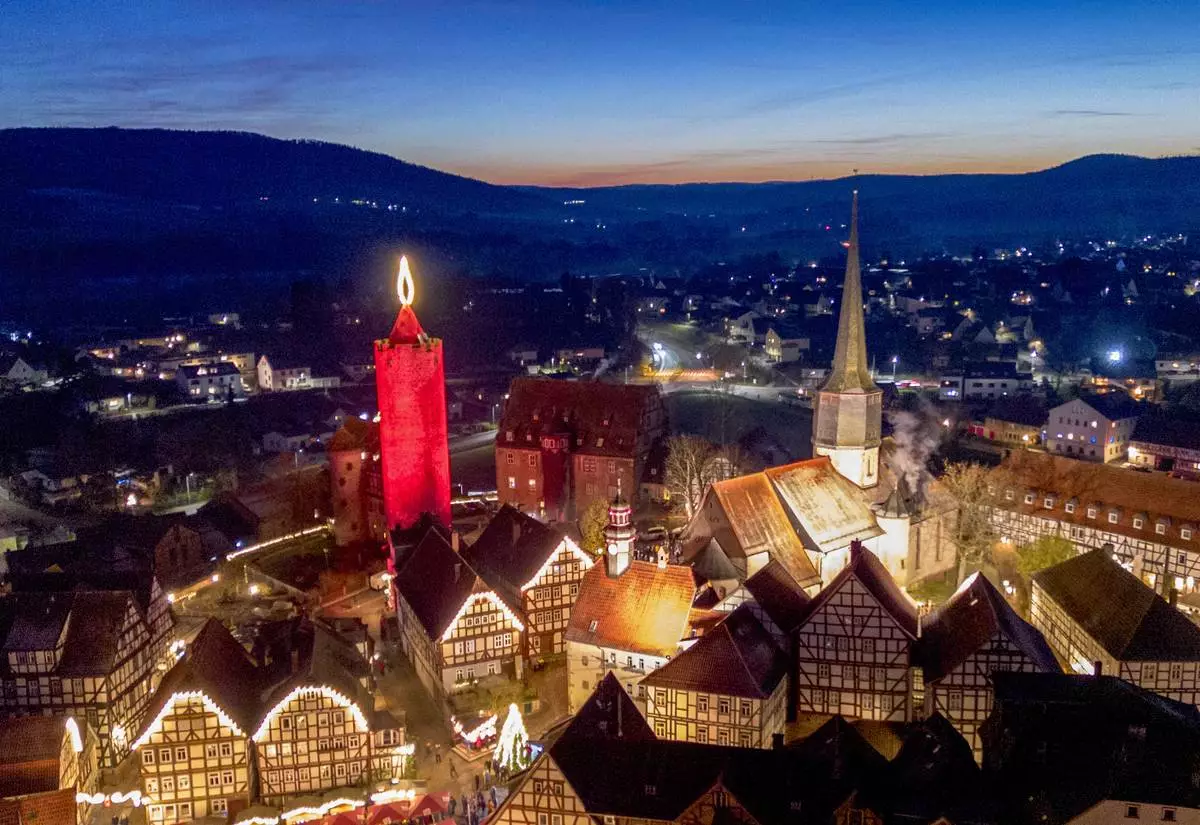 A 42-meter-high candle which is an illuminated medieval tower shines in the historic city centre of Schlitz, Germany, Saturday, Nov. 30, 2024. (AP Photo/Michael Probst)