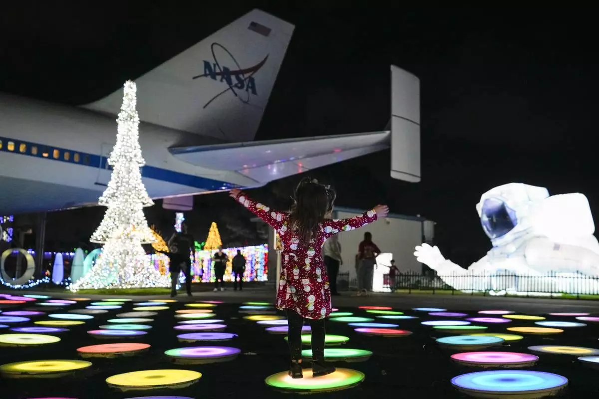 A child plays among space-themed holiday lights near a replica of shuttle Independence at Space Center Houston on Monday, Dec. 9, 2024, in Houston. (AP Photo/Ashley Landis)