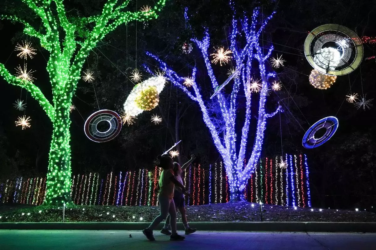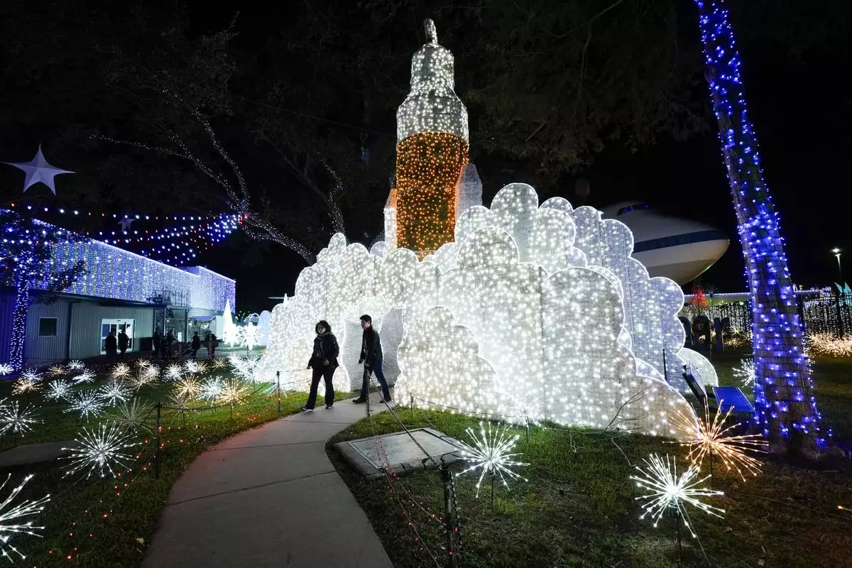 People walk among space-themed holiday lights at Space Center Houston on Monday, Dec. 9, 2024, in Houston. (AP Photo/Ashley Landis)