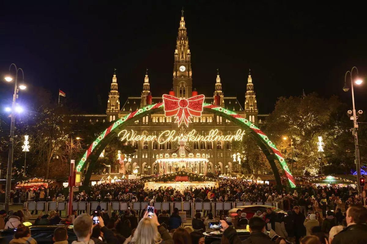 People crowd the Wiener Chritkindlmarkt in front of Vienna's city hall, one of Vienna's most popular Christmas markets, in Vienna, Austria, Saturday, Nov. 16, 2024. (AP Photo/Christian Bruna)