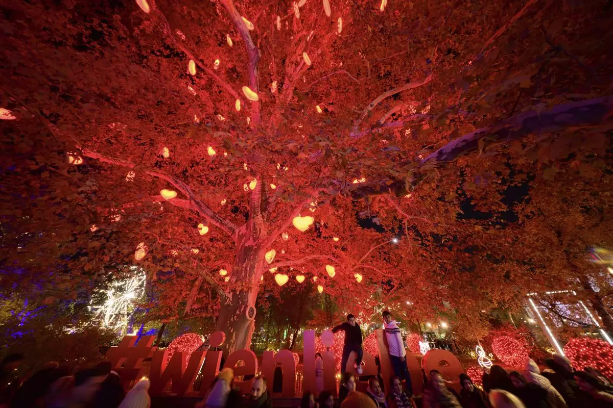 People walk through a Christmas light trail during a lighting test of the Christmas Garden in the Botanical Garden in Berlin, Germany, Tuesday, Nov. 19, 2024. (AP Photo/Markus Schreiber)
