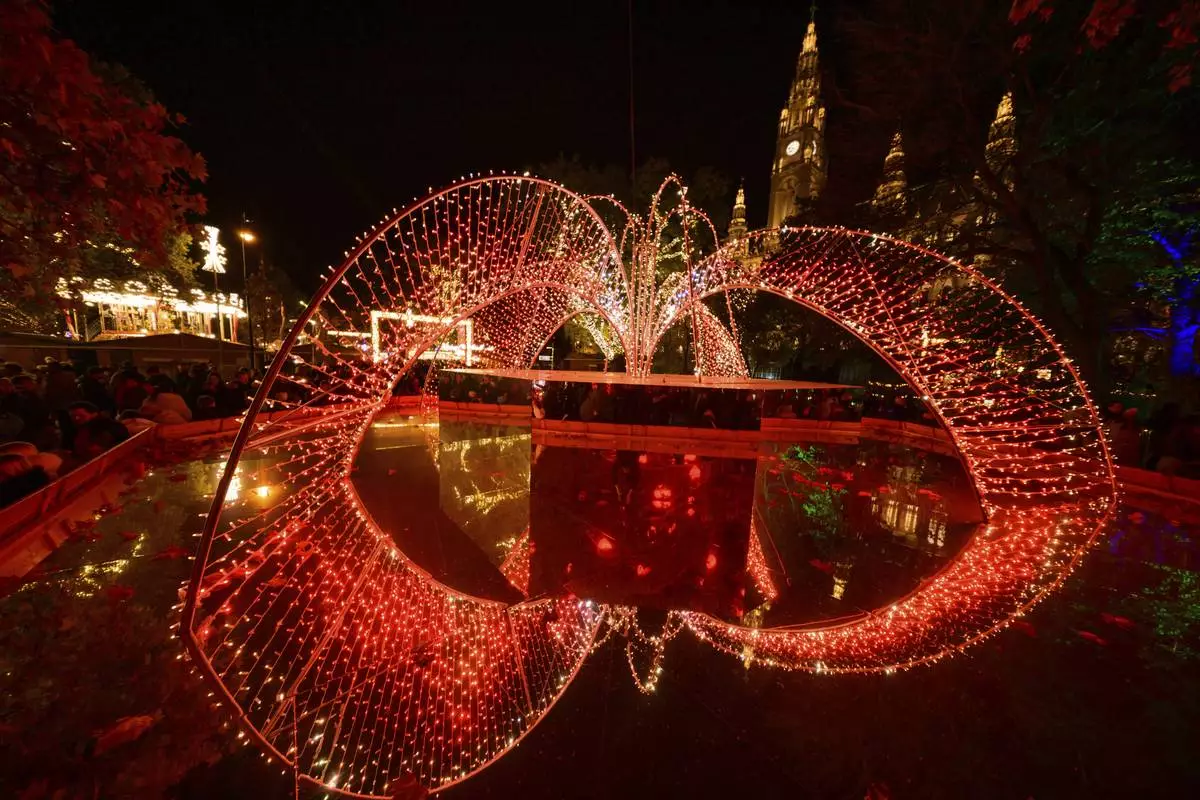 Illuminations of the Wiener Chritkindlmarkt in front of Vienna's city hall, one of Vienna's most popular Christmas markets, in Vienna, Austria, Saturday, Nov. 16, 2024. (AP Photo/Christian Bruna)