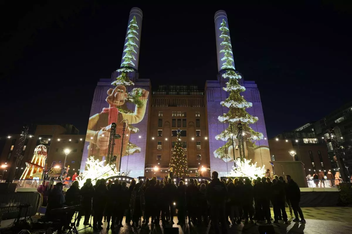 Images of cartoon characters Wallace & Gromit created by British animation studio Aardman, are projected at the Battersea Power Station to celebrate the Christmas season, in London, Friday, Nov. 29 2024. (AP Photo/Kin Cheung)