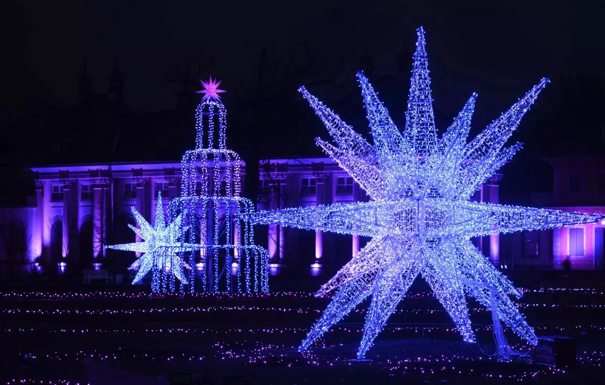 The pleasure garden and the water palace are illuminated at the opening of the "Christmas Garden" light show in the grounds of Pillnitz Palace, Dresden, Germany, Thursday Nov. 21, 2024. (Robert Michael/dpa via AP)