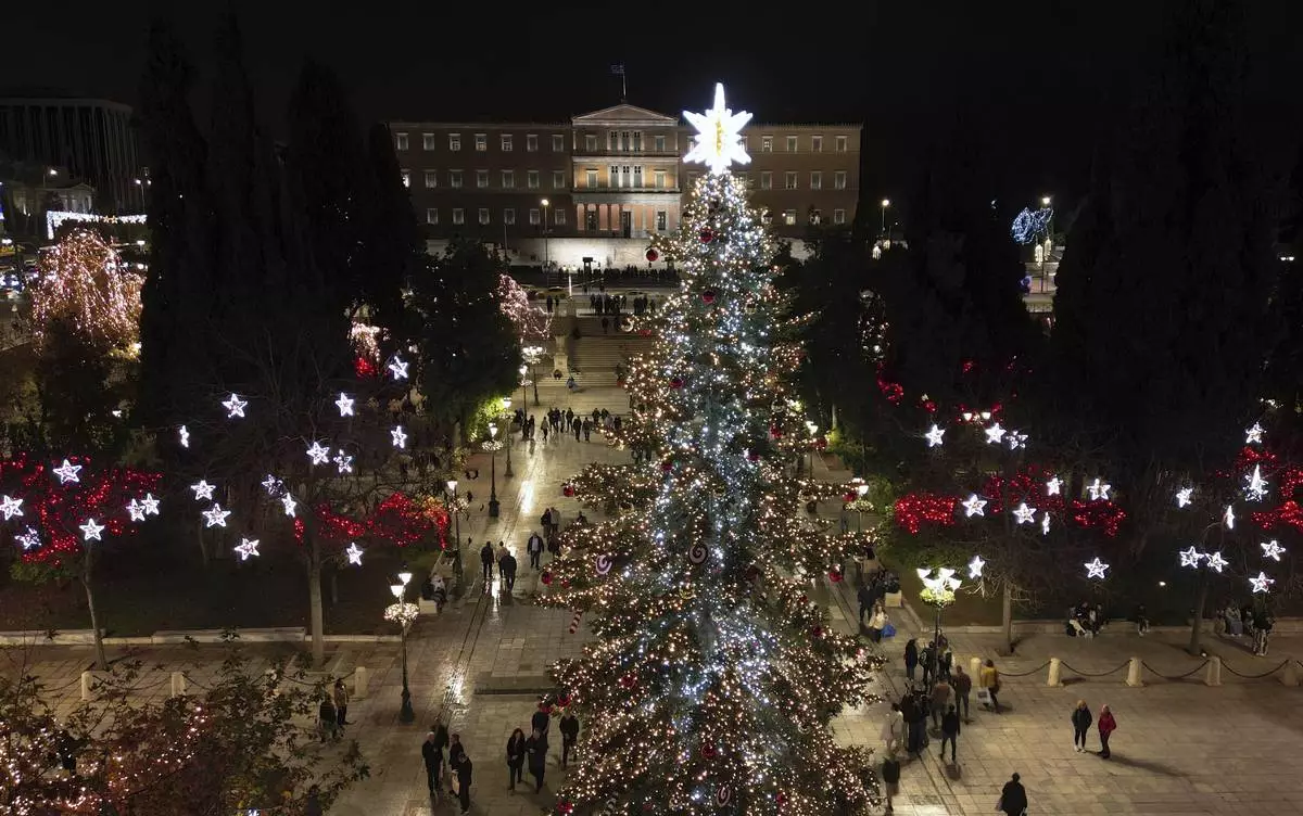 People walk at Syntagma square as the Christmas tree is illuminated in Athens, Greece, Monday, Dec. 9, 2024. (AP Photo/Thanassis Stavrakis)