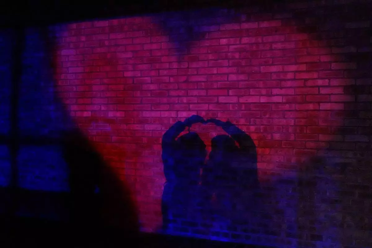 Visitors are silhouetted as they make heart sign while they walk through "Courtyard of Love" as part of the Chicago Botanic Garden's 1.3-mile, sixth annual Lightscape holiday experience of light and music in Glencoe, Ill., Wednesday, Dec. 4, 2024. (AP Photo/Nam Y. Huh)
