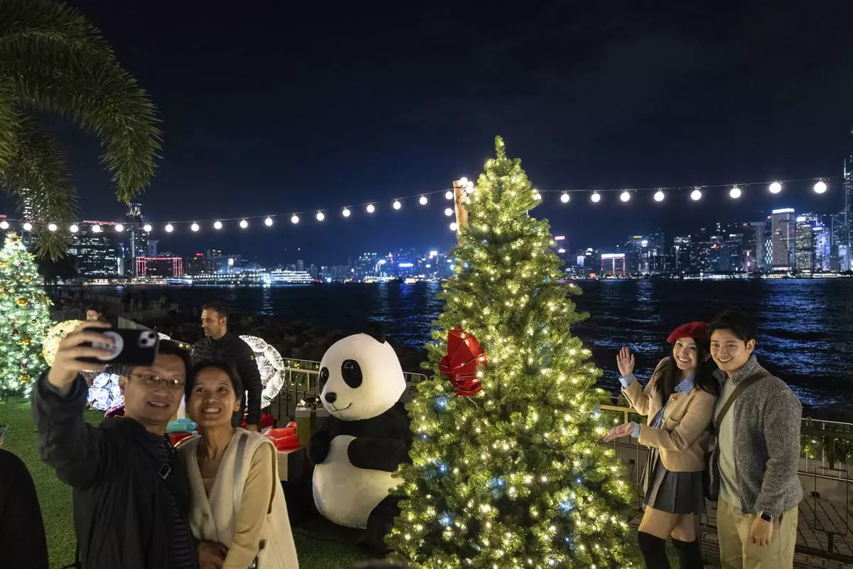 People take pictures with the Christmas tree at the waterfront of the Victoria Harbour in West Kowloon Cultural District as the city prepares for the upcoming Christmas in Hong Kong, Friday, Nov. 22, 2024. (AP Photo/Chan Long Hei)