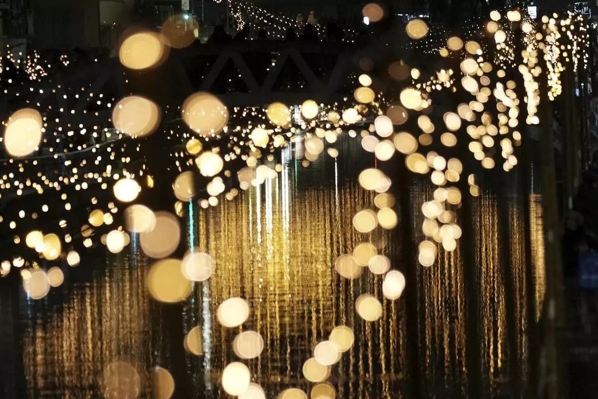 People stand on a bridge as Christmas lights illuminate the Darsena dei Navigli, the neighborhood named for the canals that run through this area of Milan, Italy, Monday, Dec. 9, 2024. (AP Photo/Antonio Calanni)