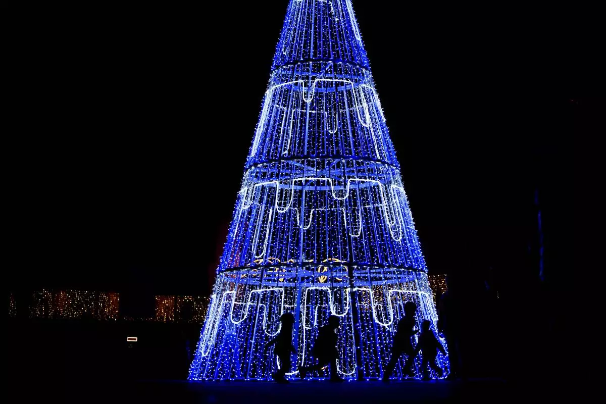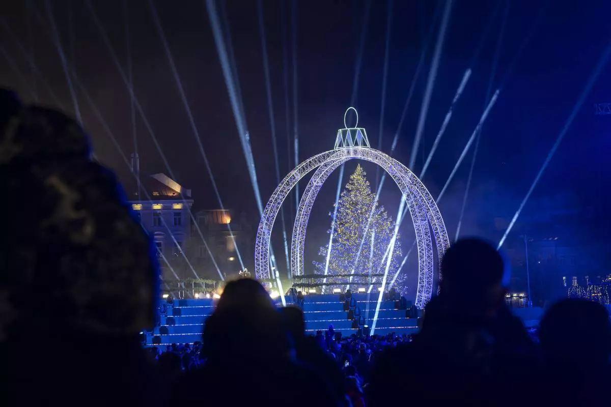 The National Christmas tree is lit during the lighting ceremony at Cathedral square in Vilnius, Lithuania, Friday, Nov. 29, 2024. (AP Photo/Mindaugas Kulbis)