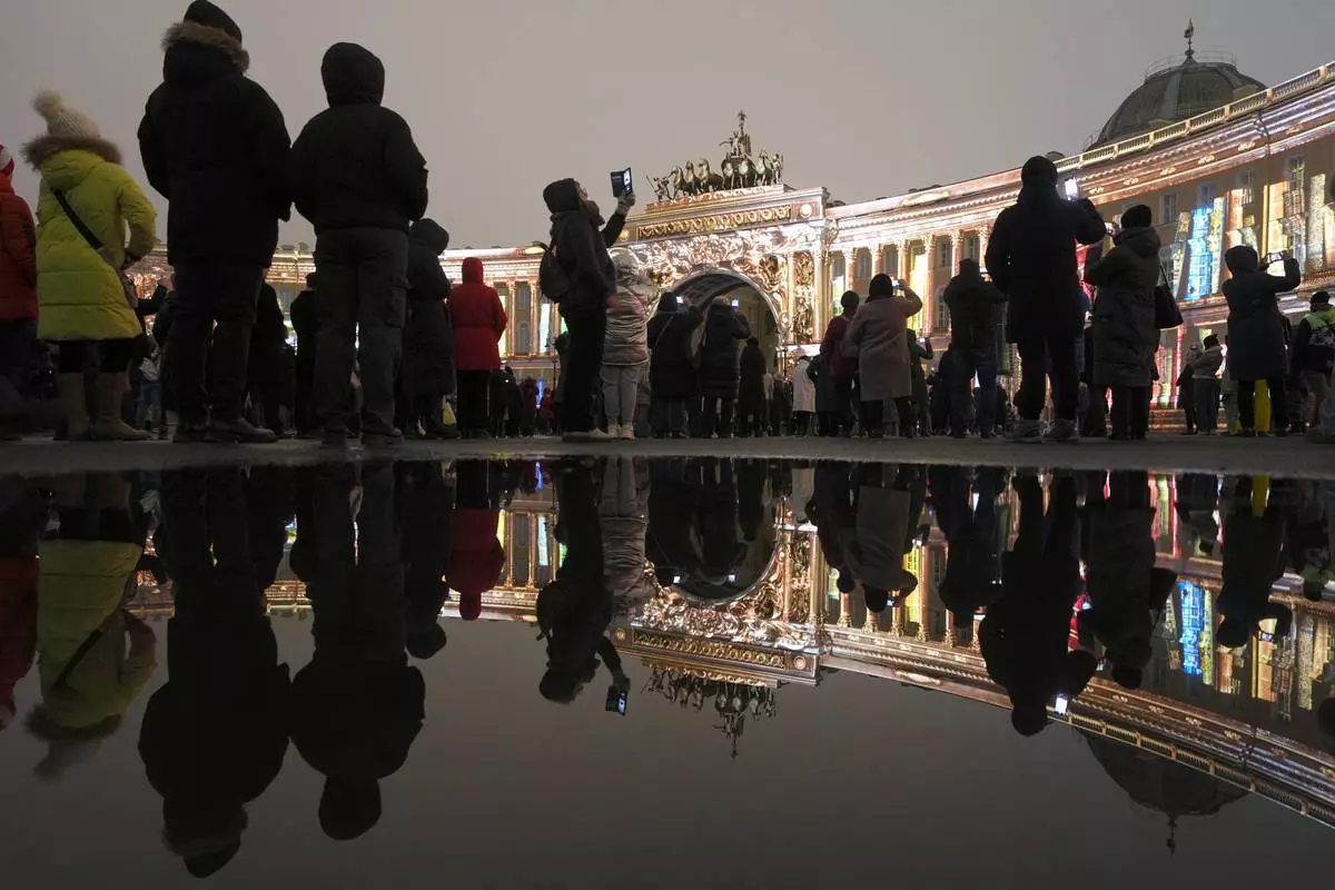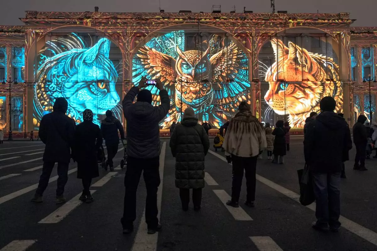 People watch a light show at the Palace Square in St. Petersburg, Russia, Sunday, Dec. 8, 2024. (AP Photo/Dmitri Lovetsky)