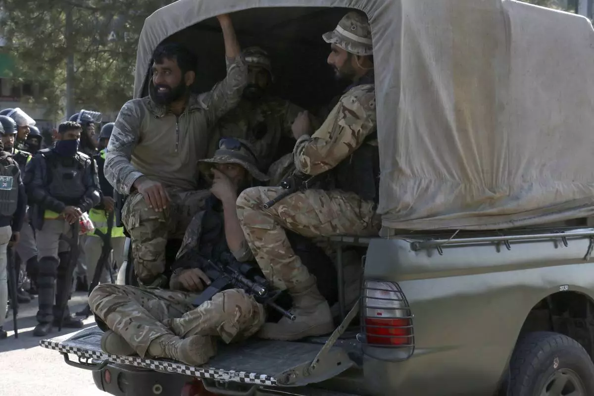 Pakistan's army troops move toward the Red Zone, which is an area that houses key government buildings, to take position ahead of the rally of supporters of imprisoned former premier Imran Khan's Pakistan Tehreek-e-Insaf party, in Islamabad, Pakistan, Tuesday, Nov. 26, 2024. (AP Photo/Ehsan Shahzad)
