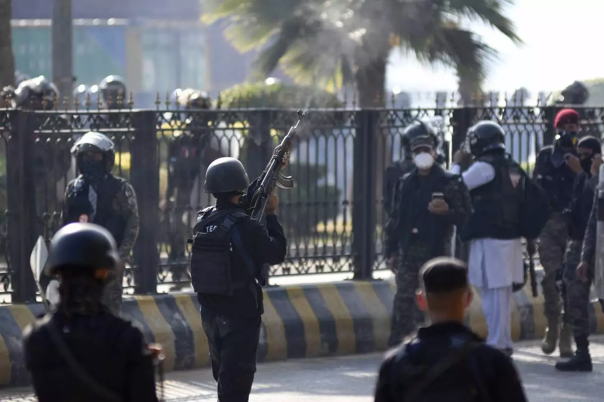 A police officer fires warning shots in the air during clashes with supporters of imprisoned former premier Imran Khan's Pakistan Tehreek-e-Insaf party, in Islamabad, Pakistan, Tuesday, Nov. 26, 2024. (AP Photo/W.K. Yousufzai)