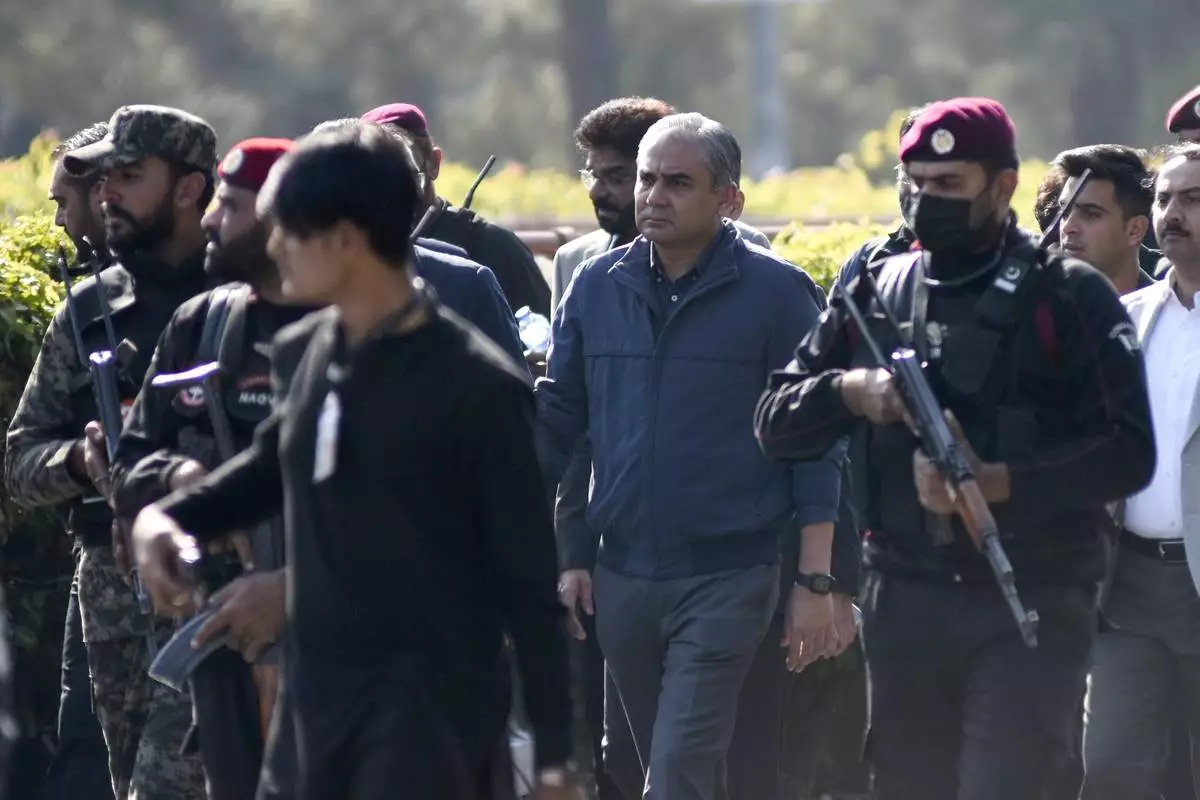 Security officials escort Pakistan's Interior Minister Mohsin Naqvi, center, who arrives to talk with media regarding current situation at D-Chowk square close to Red Zone, which is an area that houses key government buildings in Islamabad, Pakistan, Tuesday, Nov. 26, 2024. (AP Photo/W.K. Yousufzai)