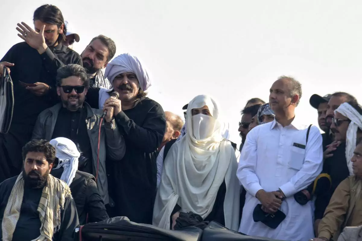 Bushra Bibi, center, wife of imprisoned former premier Imran Khan and leaders of Khan's party lead their supporters during a rally demanding Khan's release, in Islamabad, Pakistan, Tuesday, Nov. 26, 2024. (AP Photo/W.K. Yousufzai)