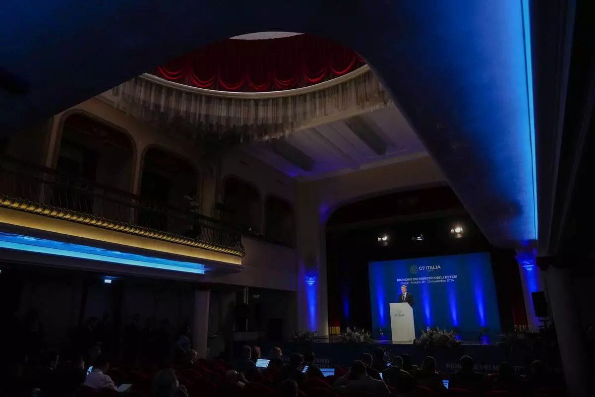 A view of the Palacongressi where Foreign Ministers of the G7 and from different Arab countries met at the G7 of foreign Ministers in Fiuggi, some 70 kilometers south-east of Rome, Monday, Nov. 25, 2024. (AP Photo/Alessandra Tarantino)