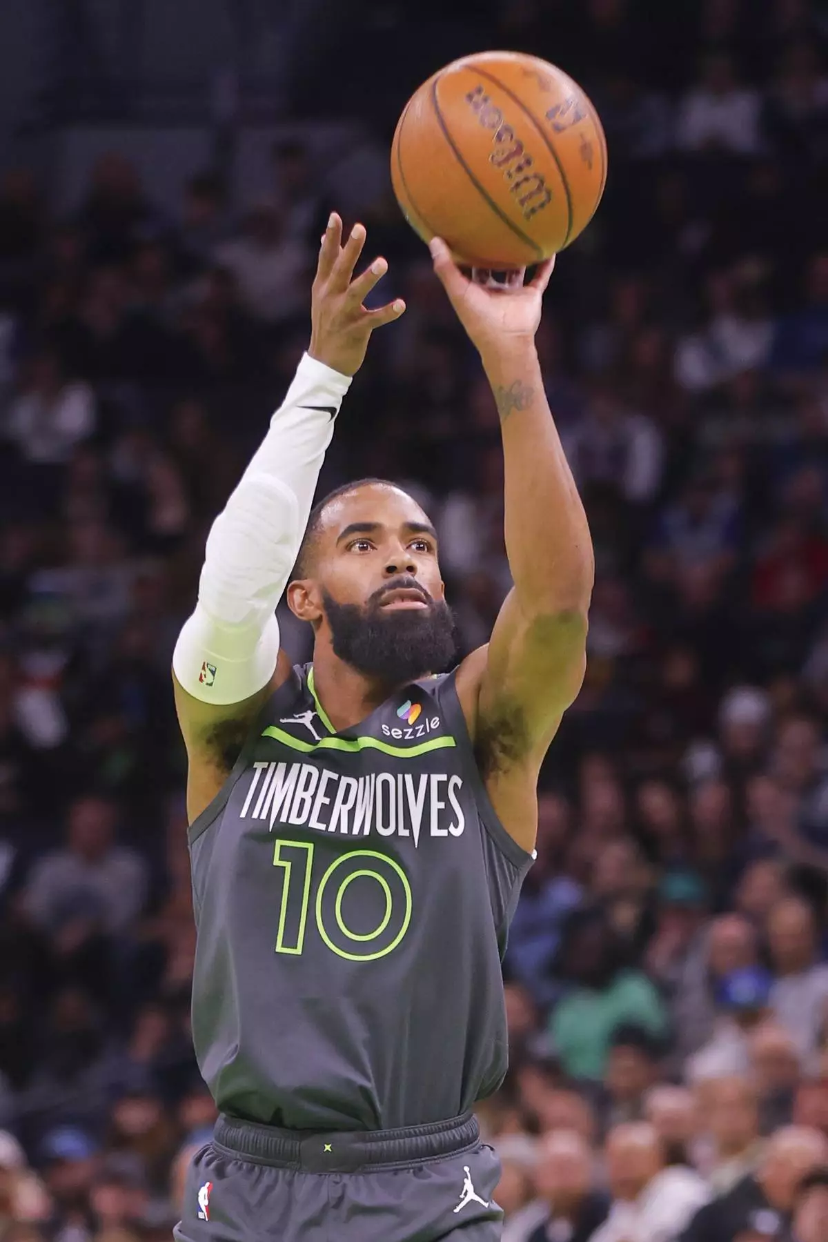 Minnesota Timberwolves guard Mike Conley shoots against the Los Angeles Clippers in the first quarter of an Emirates NBA Cup basketball game Friday, Nov. 29, 2024, in Minneapolis. (AP Photo/Bruce Kluckhohn)