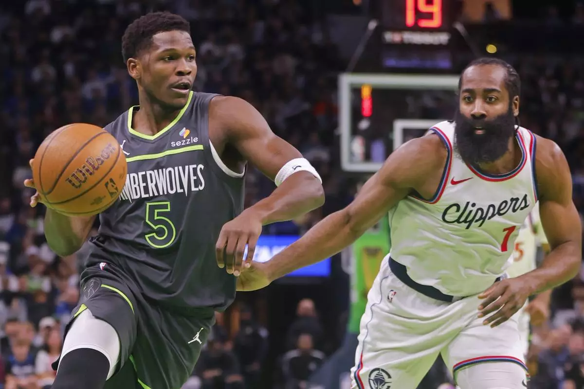 Minnesota Timberwolves guard Anthony Edwards (5) works around Los Angeles Clippers guard James Harden (1) in the first quarter of an Emirates NBA Cup basketball game Friday, Nov. 29, 2024, in Minneapolis. (AP Photo/Bruce Kluckhohn)