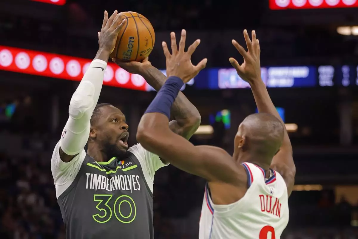 Minnesota Timberwolves forward Julius Randle (30) shoots against Los Angeles Clippers guard Kris Dunn (8) in the first quarter of an NBA basketball game Friday, Nov. 29, 2024, in Minneapolis. (AP Photo/Bruce Kluckhohn)