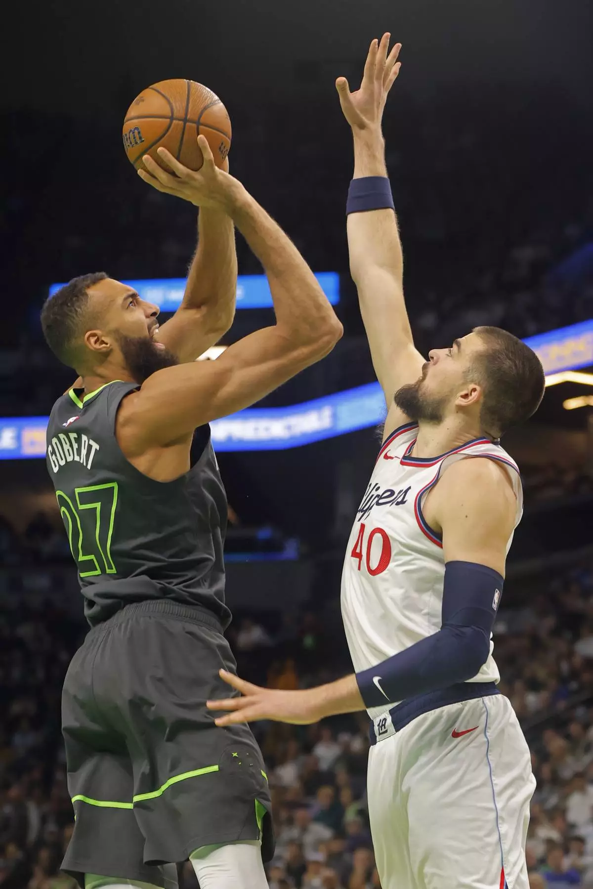Minnesota Timberwolves center Rudy Gobert (27) shoots against Los Angeles Clippers center Ivica Zubac (40) in the first quarter of an Emirates NBA Cup basketball game Friday, Nov. 29, 2024, in Minneapolis. (AP Photo/Bruce Kluckhohn)