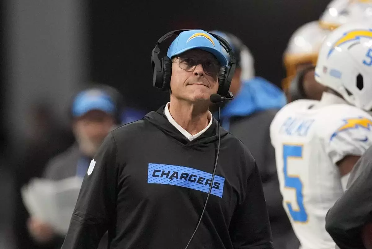 Los Angeles Chargers head coach Jim Harbaugh watches from the sidelines during the first half of an NFL football game against the Atlanta Falcons on Sunday, Dec. 1, 2024 in Atlanta. (AP Photo/John Bazemore)