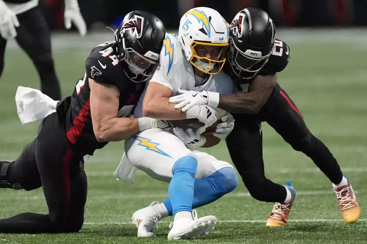Los Angeles Chargers wide receiver Ladd McConkey (15) is hit by Atlanta Falcons linebacker Troy Andersen (44) and cornerback Dee Alford (20) during the second half of an NFL football game on Sunday, Dec. 1, 2024 in Atlanta. (AP Photo/John Bazemore)