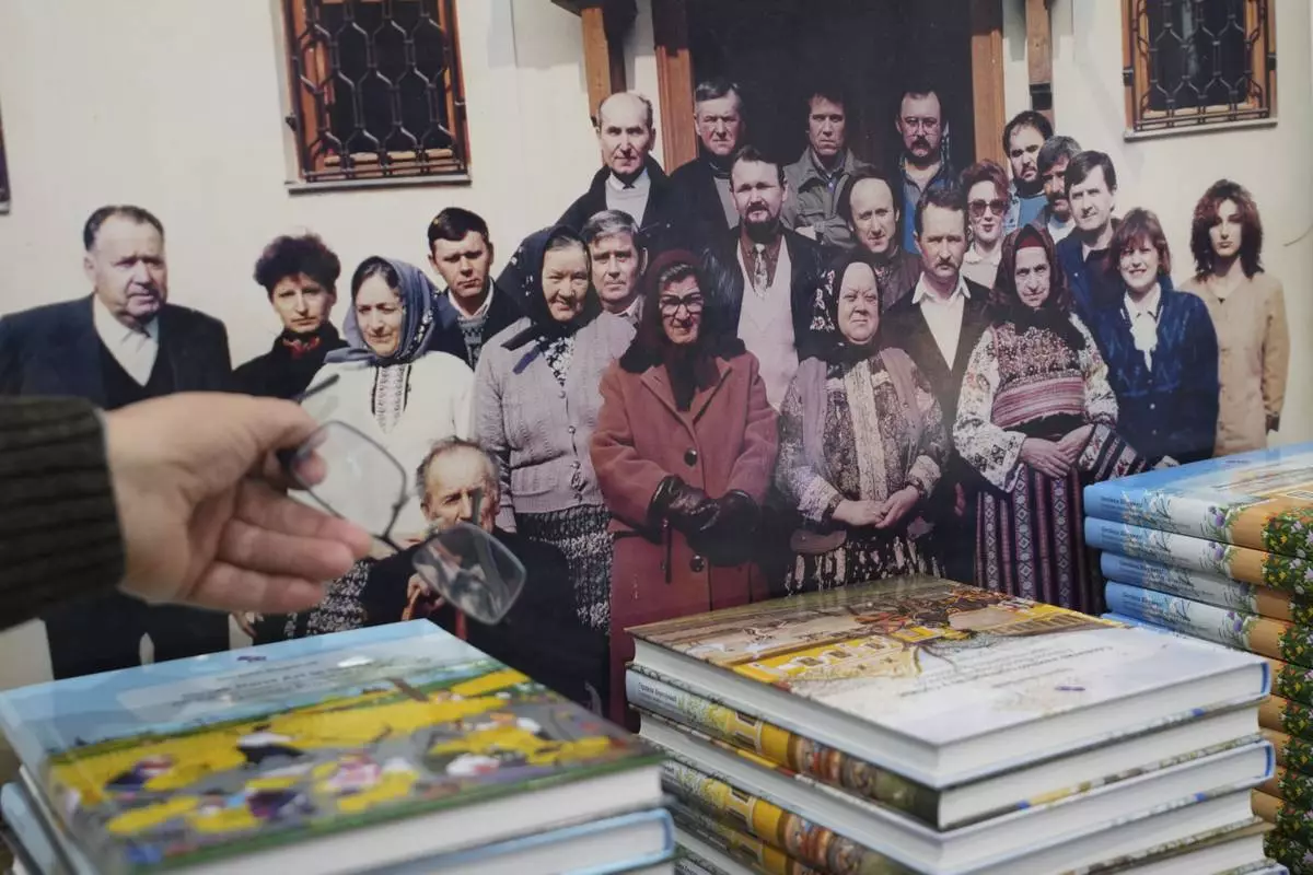 Pavel Babka, gallerist and naïve art expert shows the photo of older generations of naïve painters in the village of Kovacica, Serbia, Thursday, Nov. 28, 2024. (AP Photo/Darko Vojinovic)