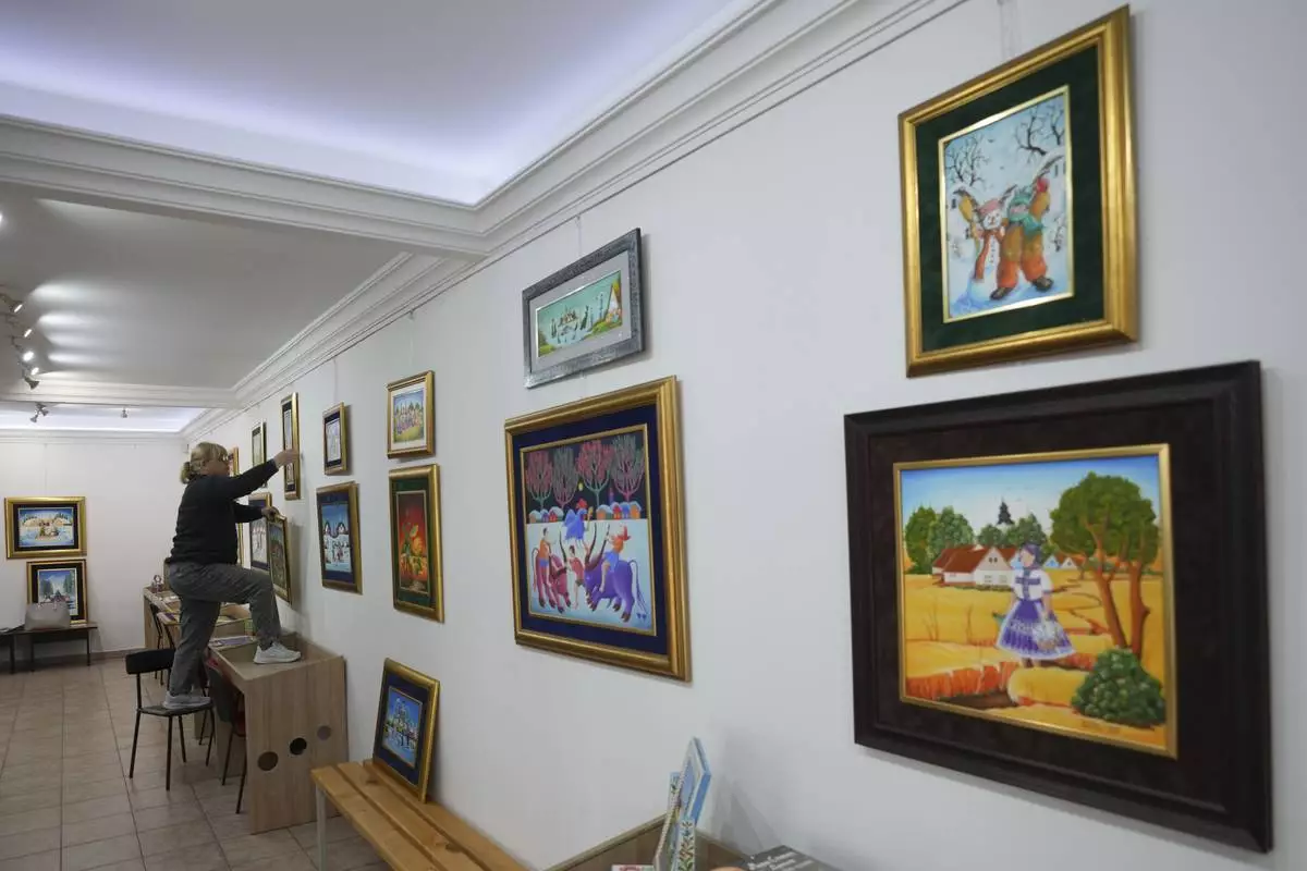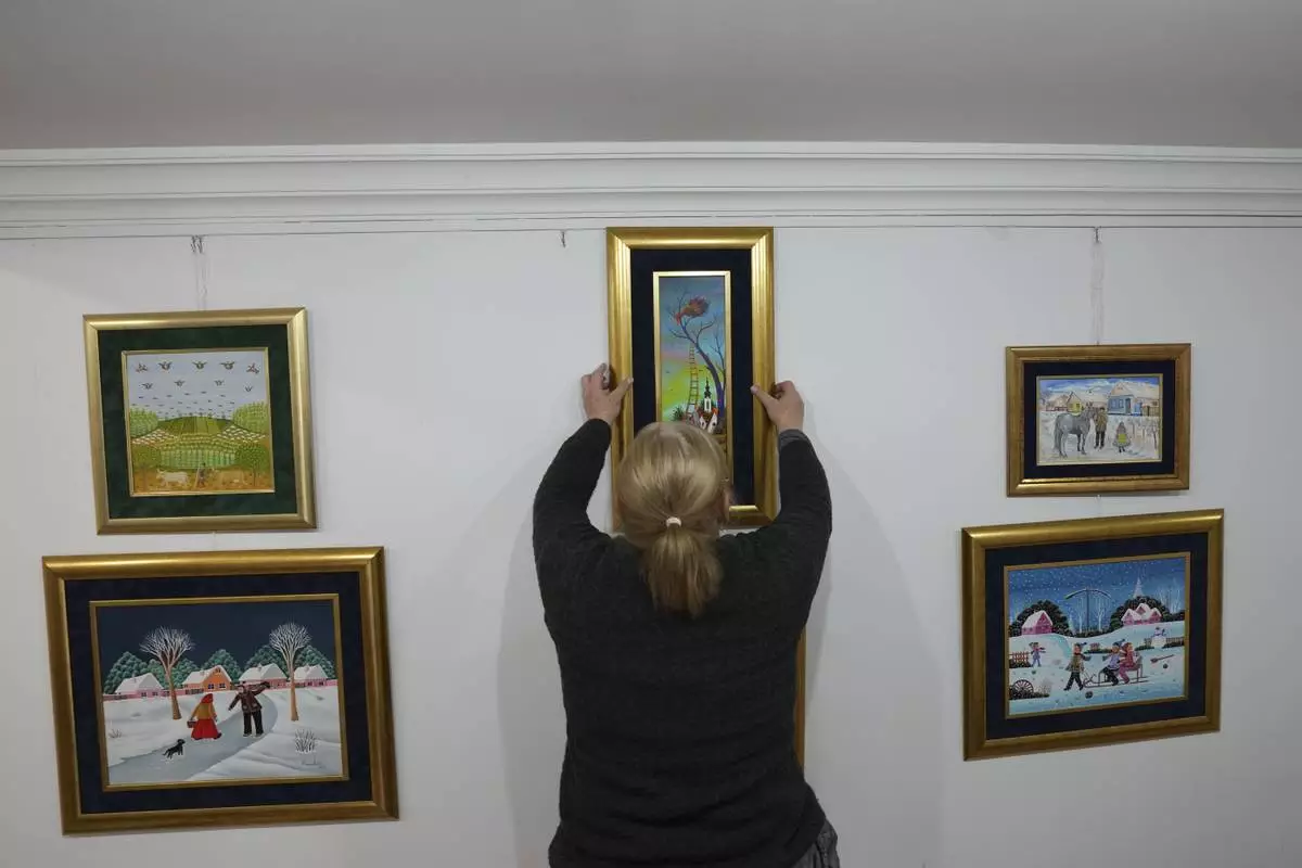 Klara Babka hangs a painting in the Gallery of naive art in the village of Kovacica, Serbia, Thursday, Nov. 28, 2024. (AP Photo/Darko Vojinovic)