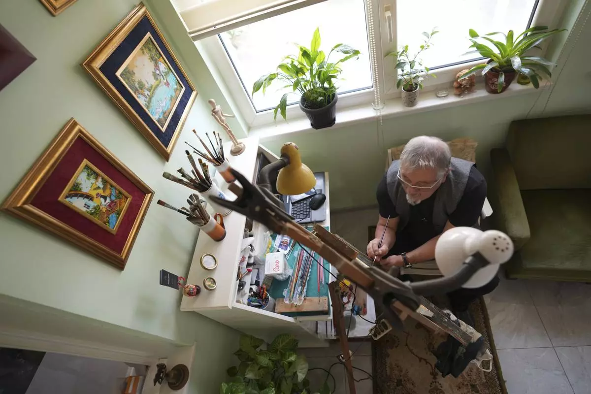 Stefan Varga paints in his room in the village of Kovacica, Serbia, Thursday, Nov. 28, 2024. (AP Photo/Darko Vojinovic)