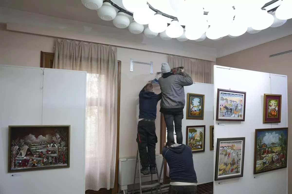 Workers put up air conditioner in the Gallery of naive art in the village of Kovacica, Serbia, Thursday, Nov. 28, 2024. (AP Photo/Darko Vojinovic)