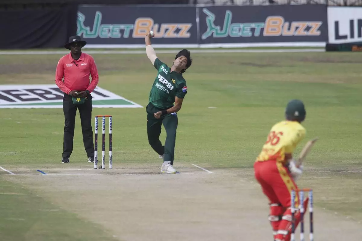 Pakistan's Mohammad Hasnain bowls during the third T20 cricket match between Zimbabwe and Pakistan at Queens Sports Club in Bulawayo, Zimbabwe, Thursday, Dec. 5, 2024. (AP Photo/Wonder Mashura)