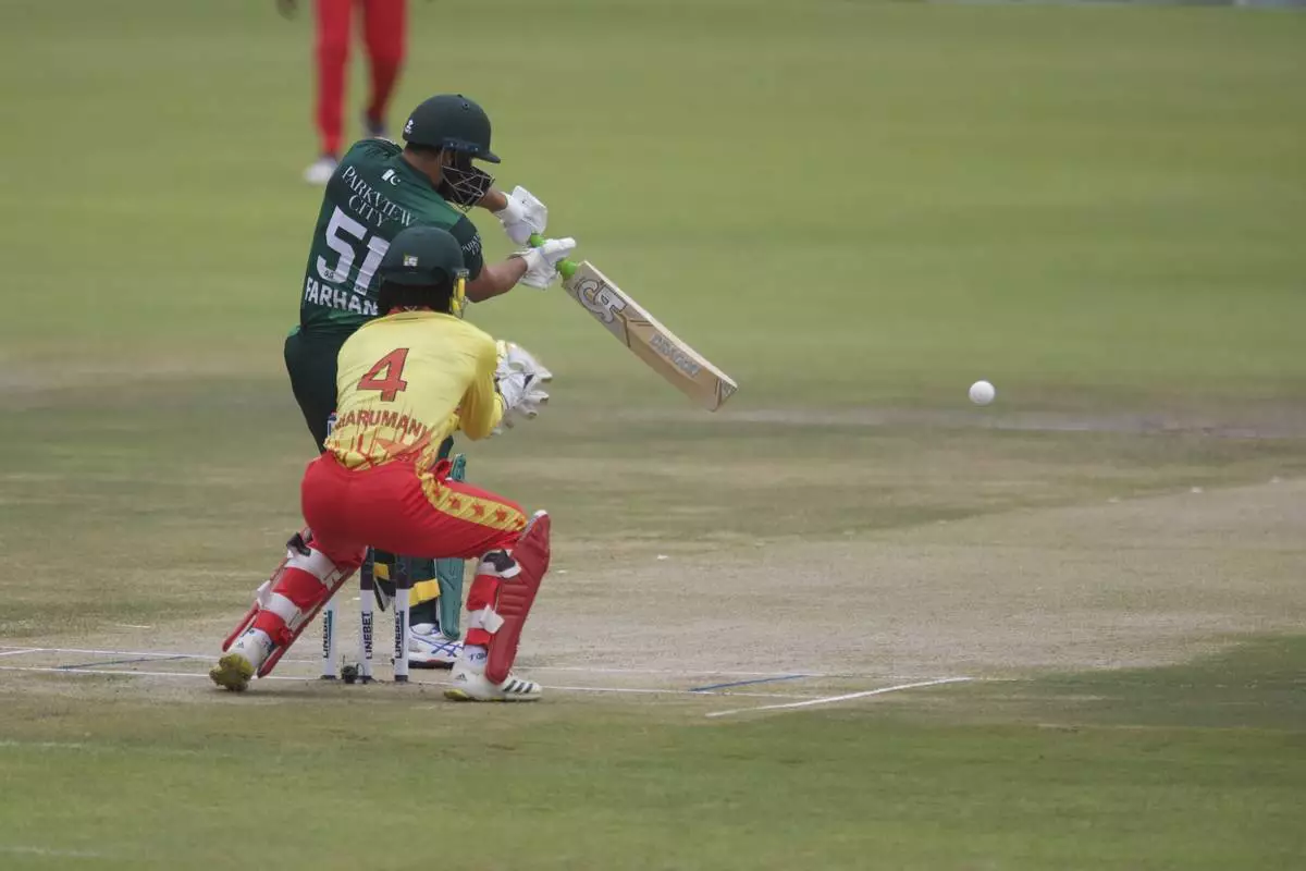Pakistan's Sahibzada Farhan at the wicket in front of Zimbabwe's Tadiwanashe Marumani during the third T20 cricket match between Zimbabwe and Pakistan at Queens Sports Club in Bulawayo, Zimbabwe, Thursday, Dec. 5, 2024. (AP Photo/Wonder Mashura)