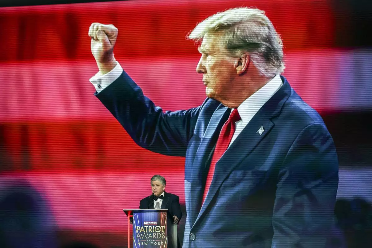 Sean Hannity introduces President-elect Donald Trump before awarding him the 'Patriot of the Year' award at the FOX Nation Patriot Awards, Thursday, Dec. 5, 2024, in Greenvale, N.Y. (AP Photo/Heather Khalifa)