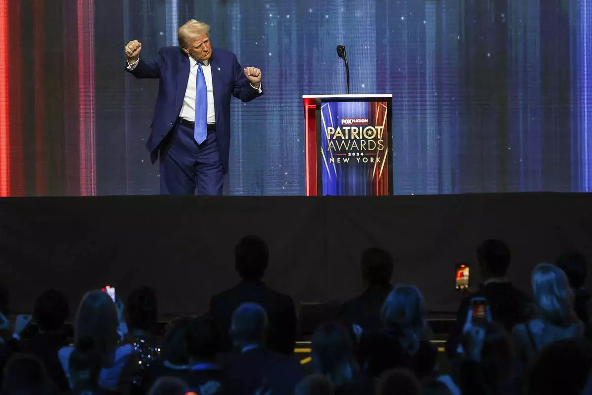 President-elect Donald Trump takes the stage before he speaks at the FOX Nation Patriot Awards, Thursday, Dec. 5, 2024, in Greenvale, N.Y. (AP Photo/Heather Khalifa)
