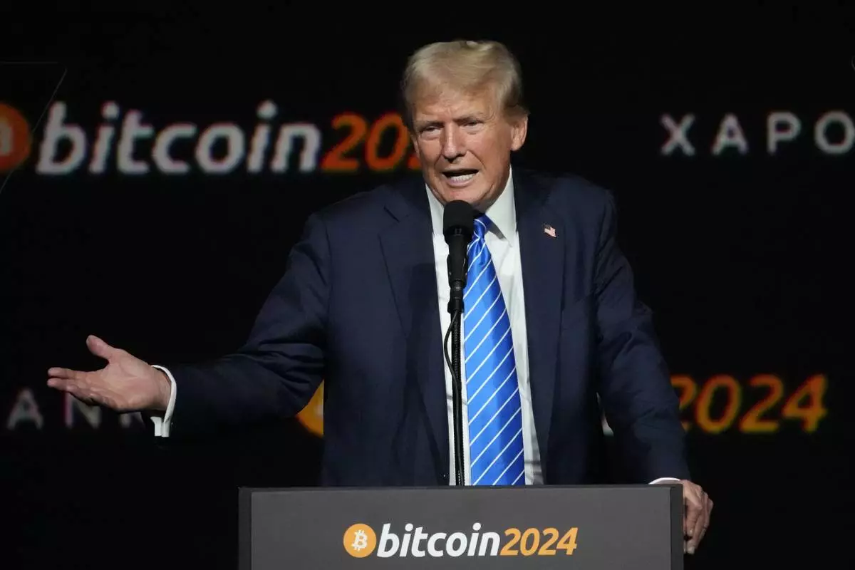 FILE - Republican presidential nominee former President Donald Trump speaks at the Bitcoin 2024 Conference July 27, 2024, in Nashville, Tenn. (AP Photo/Mark Humphrey, File)