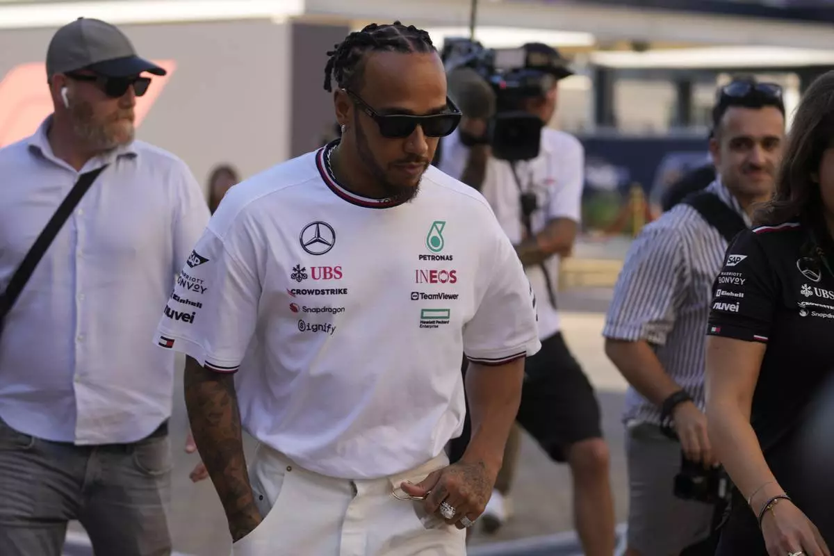 Mercedes driver Lewis Hamilton of Britain walks through paddock ahead of the Formula One Abu Dhabi Grand Prix, at the Yas Marina Circuit in Abu Dhabi, UAE, Thursday, Dec. 5, 2024. (AP Photo/Darko Bandic)