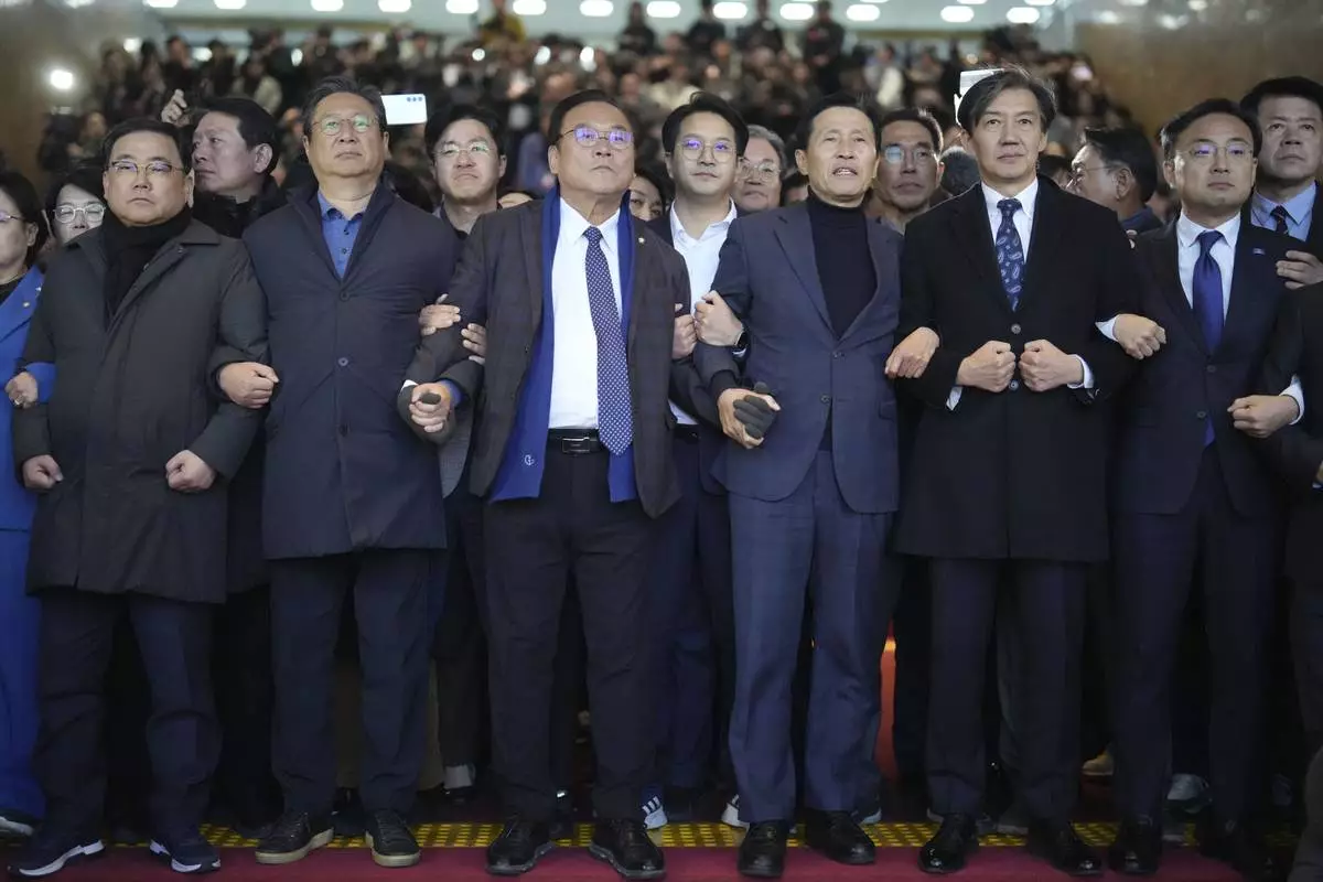 South Korean lawmakers hold arms at the National Assembly in Seoul, South Korea, Friday, Dec. 6, 2024. (AP Photo/Lee Jin-man)