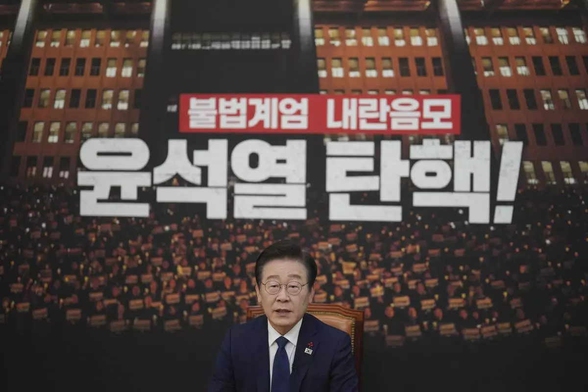 South Korea's main opposition Democratic Party leader Lee Jae-myung speaks during an interview with The Associated Press at the National Assembly in Seoul, South Korea, Friday, Dec. 6, 2024. The part of letters at bottom "Impeachment, Yoon Suk Yeol." (AP Photo/Lee Jin-man)
